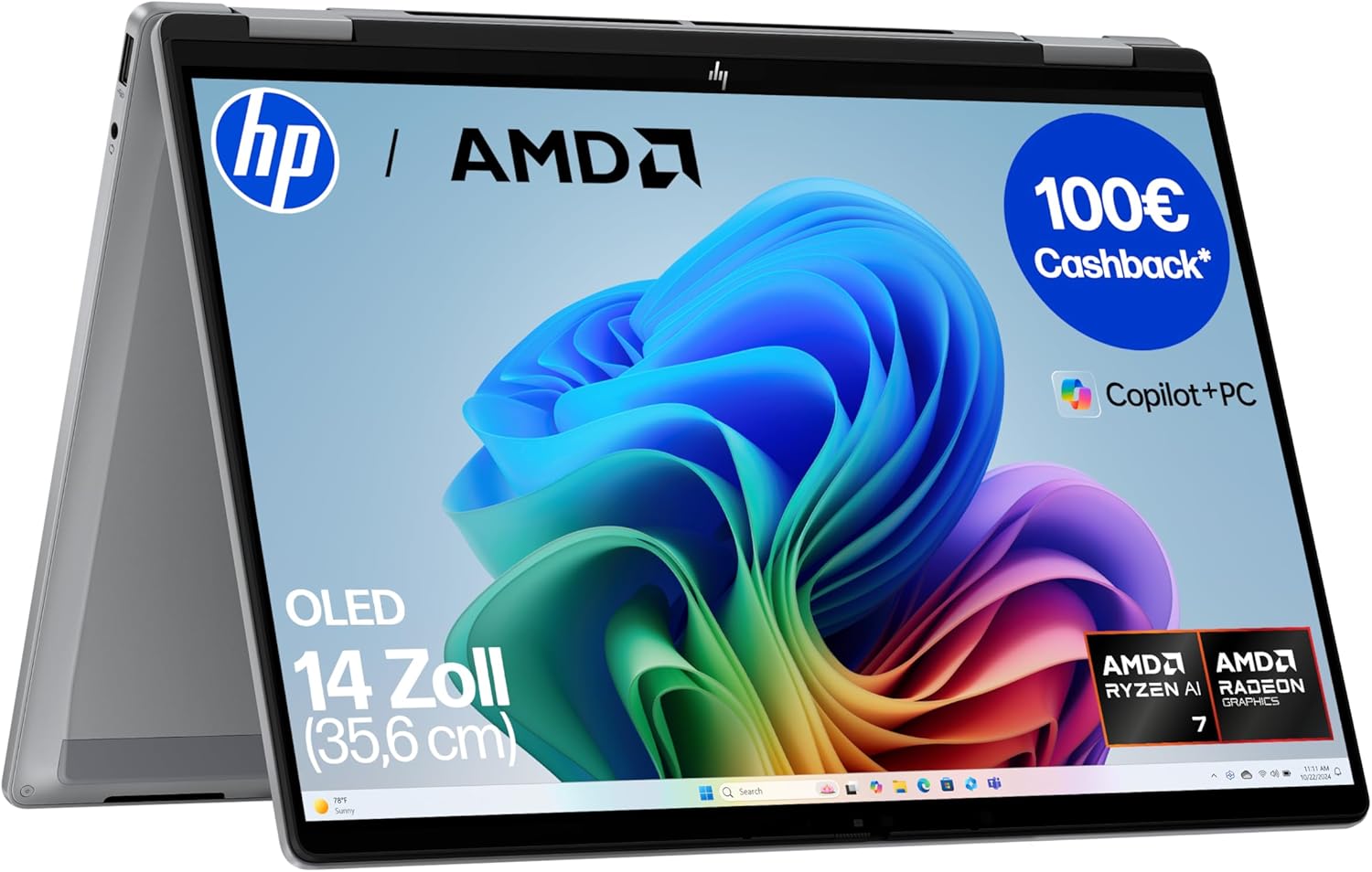 HP OmniBook X Flip 2in1 Next Gen AI Laptop AMD Ryzen AI 7 350 (8C) dedizierte NPU für KI 50 NPU Tops Copilot+ PC 14" 3K 2880x1800 OLED-Touchscreen 16GB 1TB SSD Win11 QWERTZ Silber